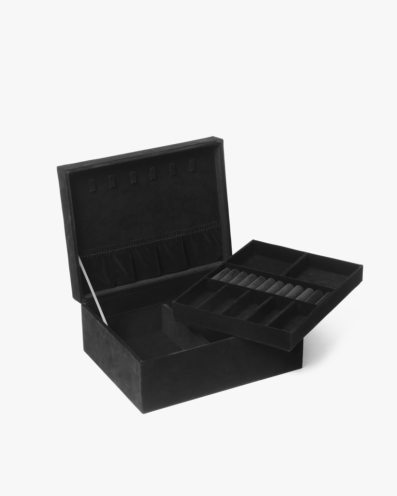 Dette romslige smykkeskrinet er perfekt til oppbevaring av alle smykkene dine. Det er designet i velur og har Day Et-logoen i sølv på forsiden. Det har magnetisk lukking, og innvendig har det flere rom slik at du kan organisere smykkene dine. Det har også et brett som kan løftes opp, slik at du får et ekstra rom til oppbevaring av smykkene dine.