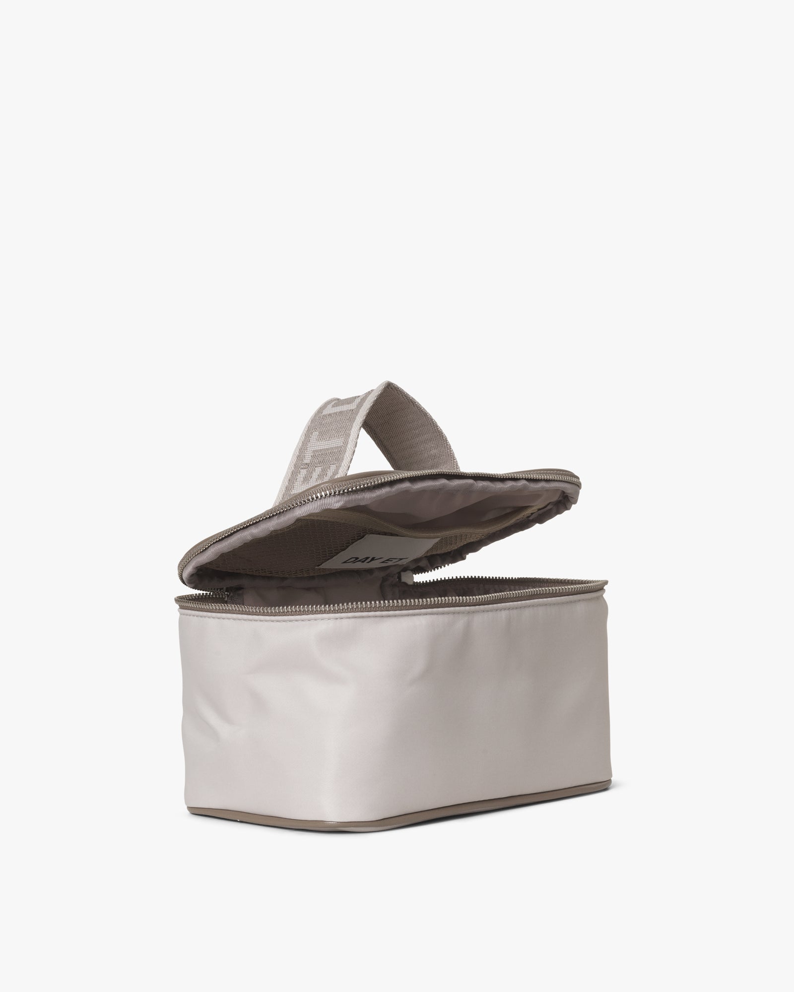 Denne kosmetikkpungen har en strukturert form, som beskytter produktene dine under transport, og har et nettfack i lokket, slik at du enkelt kan holde orden. En liten bærehank med logo gjør det enkelt å ta med, og den har detaljer som kontrastfarget glidelås og læderlignende kantbånd. Vesken er laget av 100% sertifisert resirkulert materiale.